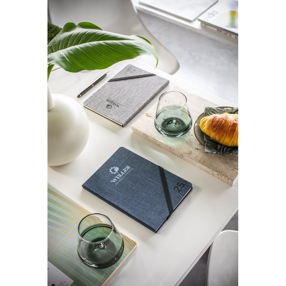 Apresentamos a Agenda A5 em 300D PET, fabricada com 100% de rPET, uma escolha consciente que une sustentabilidade e praticidade. Com dimensões ideais para facilitar o uso semanal, esta agenda está estruturada em um plano semanal, oferecendo uma visão clara e organizada dos compromissos.