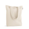 A sacola é fabricada com uma mistura inovadora de materiais sustentáveis: 50% algodão, 30% algodão reciclado e 20% poliéster reciclado, com uma gramatura de 220 g/m². Com dimensões de 380 x 400 x 100 mm, ela oferece espaço suficiente para transportar seus itens de forma prática e eficiente.