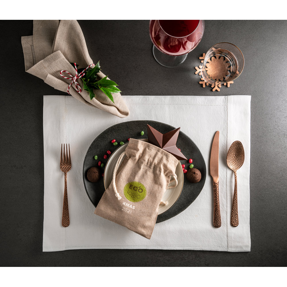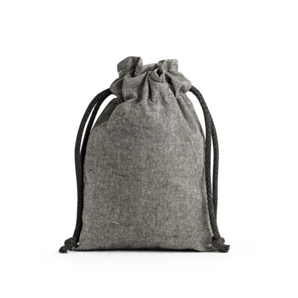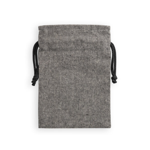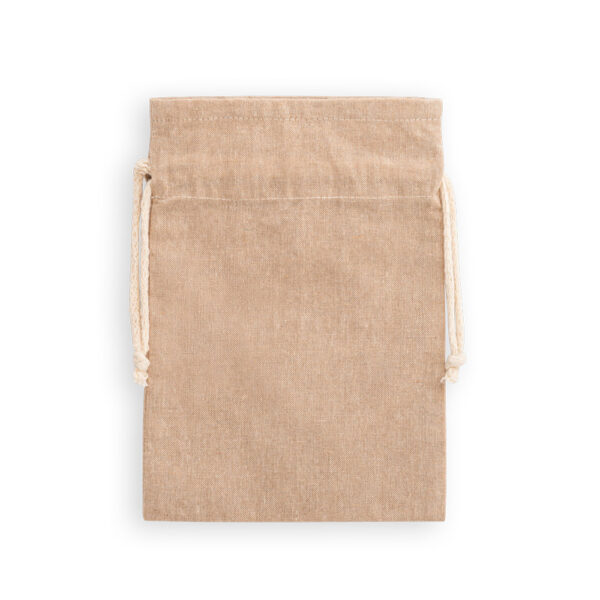 Sacola tipo mochila em 70% algodão reciclado e 30% poliéster reciclado (140 g/m²), com alças de algodão. O tecido é sem tingimento, é utilizado na sua cor original, sem produtos químicos de tingimento ou branqueamento, contribuindo para um menor impacto ambiental. 140 x 200 mm