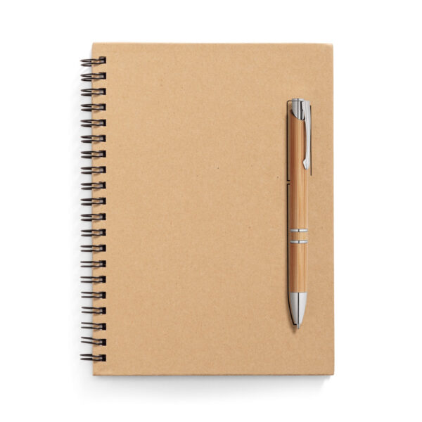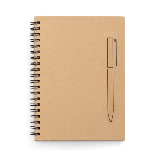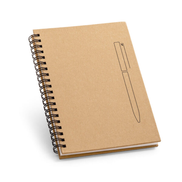 Caderno B6 espiral com capa dura em papel kraft e 70 folhas lisas em papel pedra de 120 g/m². Imã na capa que funciona como um suporte de esferográfica (não inclusa). 130 x 180 mm